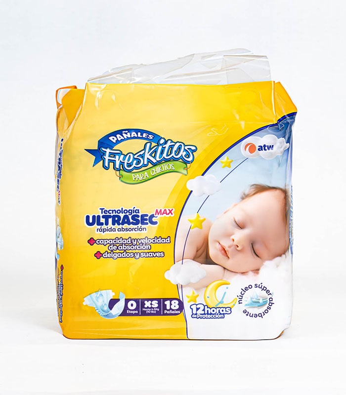 Limpia la colita de tu bebé con tu toallita húmeda preferida Freskitos 2. Abre el pañal y deslízalo debajo de la colita de tu bebé 3. Dobla la parte frontal del pañal por la entrepierna y estírala hasta que llegue a su ombliguito 4. Estira las bandas laterales de ambos lados hasta el centro del pañal y presiona.