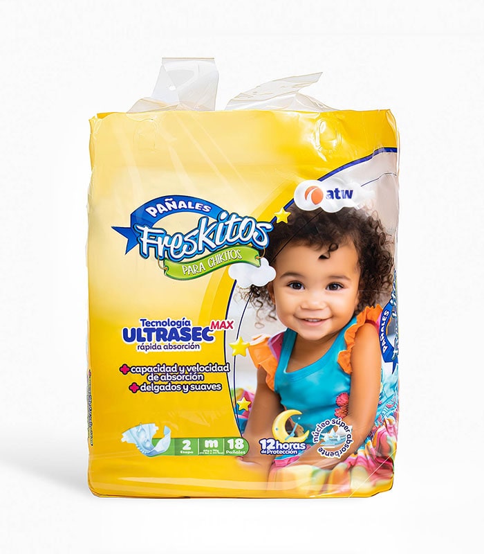 Limpia la colita de tu bebé con tu toallita húmeda preferida Freskitos 2. Abre el pañal y deslízalo debajo de la colita de tu bebé 3. Dobla la parte frontal del pañal por la entrepierna y estírala hasta que llegue a su ombliguito 4. Estira las bandas laterales de ambos lados hasta el centro del pañal y presiona.